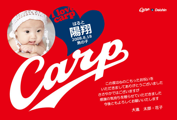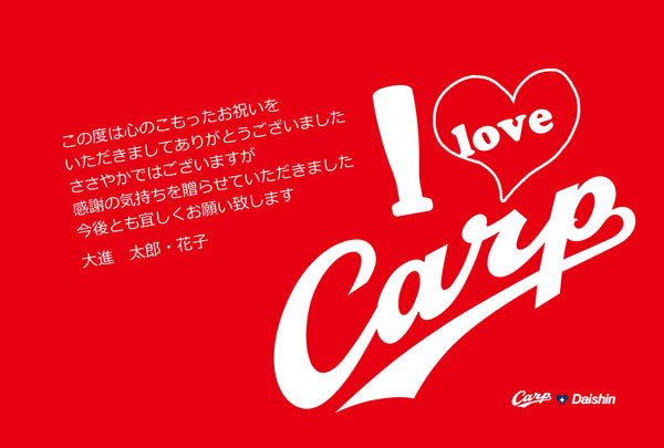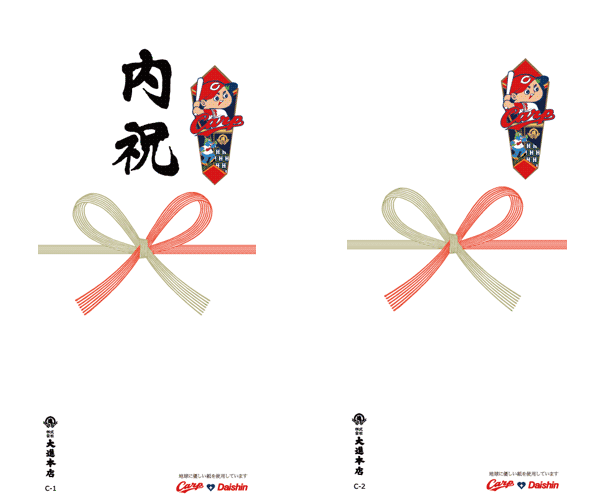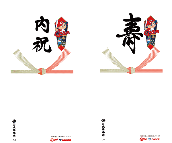 大進でお買上げいただきました商品をカープデザインの包装紙、のし、メッセージカードのセット(77円税込)でラップングいたします。